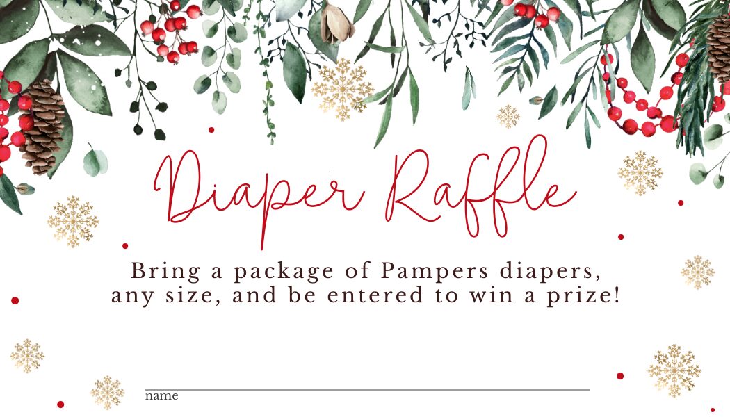 Help our new parents stock up with diapers (any size) and be entered into a fun raffle. All you have to do is bring a new pack of diapers to the shower and check-in at the raffle table — one lucky guest will win a special gift.